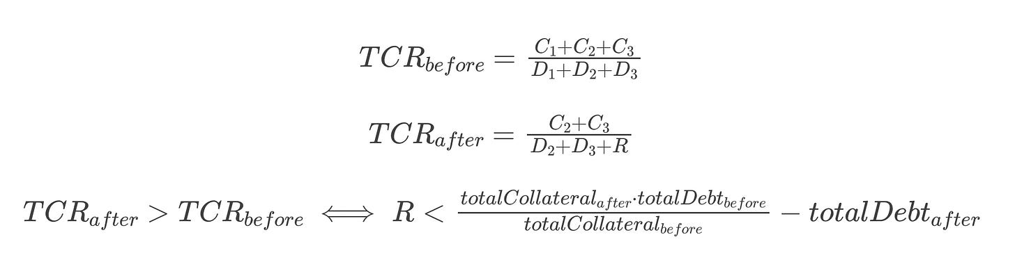 One such case was the "TCR must increase after liquidations" invariant. We believed it to hold true in all situations, but it was mathematically demonstrated to be invalid during redistributions. Specifically, during a liquidation that involves redistribution of bad debt, a portion of the CDP's debt remains in the system after the liquidator claims the collateral, which can further lower the TCR.