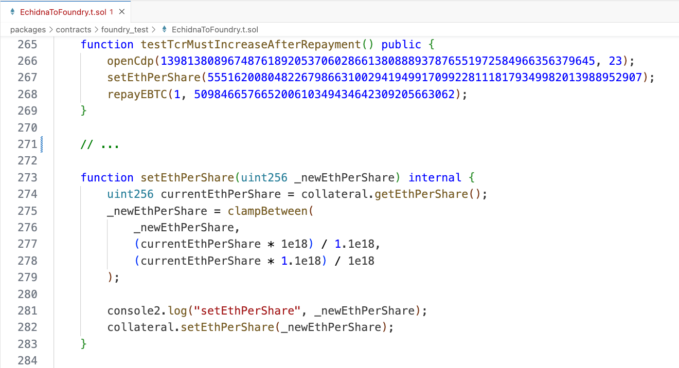 With proper code compartmentalization, this test converter can be extracted directly from the Echidna contract. Therefore, think ahead and plan accordingly when you start your fuzzing campaign. An important note is that the test setup should be consistent between Foundry and Echidna, including the initial balances, so that you can easily compare the final state of the Echidna run with that of Foundry.